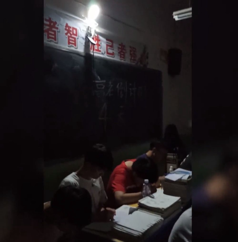 高三的學生們?yōu)樯贤碜粤暎瑢?盞臺燈掛到教室前后的黑板上,繼續(xù)學習。數(shù)學老師雷忠霖感動流淚,記錄下了這一幕。