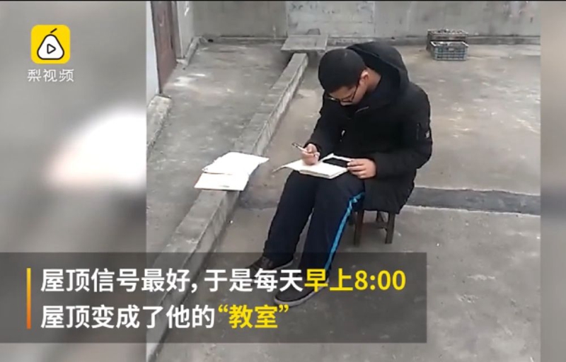 特殊時期,學校選擇了網(wǎng)上開課。小通因家中沒有WiFi,又舍不得用流量,就向鄰居求助,蹭隔壁家的WIFI。屋頂信號最好,于是才有了“學霸上屋頂”的勵志一幕。