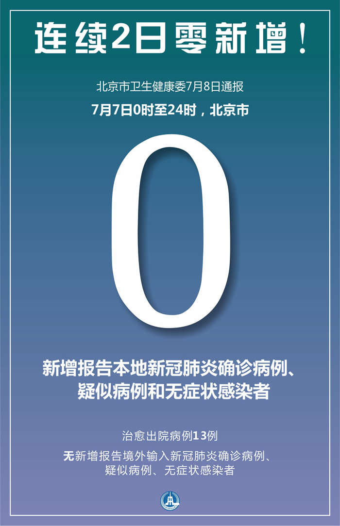 新華社北京7月8日電(記者俠克)北京市衛生健康委8日通報,7月7日0時至24時,北京市無新增報告本地新冠肺炎確診病例、疑似病例和無癥狀感染者,治愈出院病例13例;無新增報告境外輸入新冠肺炎確診病例、疑似病例、無癥狀感染者。北京市連續2日無新增確診病例。