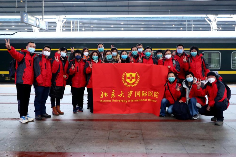 北京大學國際醫院醫療隊隊員在北京西站合影,準備乘坐火車馳援湖北抗疫(2月6日攝)。新華社記者張玉薇攝