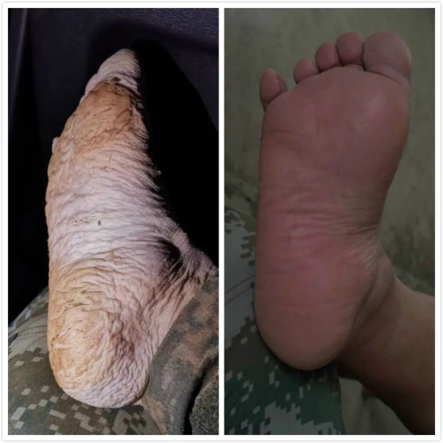 東至縣人武部部長(zhǎng)南小勇回憶,在回來(lái)的路上,由于大家身上的衣服都沾滿了泥漿,眾人就把衣服脫了下來(lái)坐車返回。大家的目光一下子就集中在陳壽春的腳上,南小勇拍下了照片,發(fā)到了工作群里,引發(fā)第一波“心疼”。