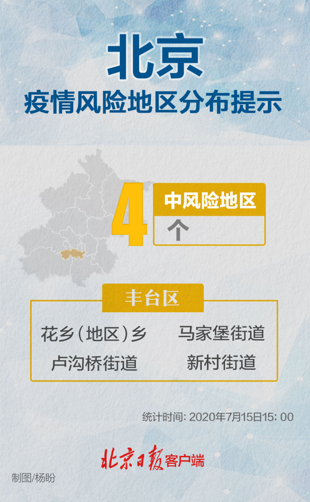 今天下午,在北京市新型冠狀病毒肺炎疫情防控工作第152場新聞發(fā)布會上,市疾控中心副主任龐星火介紹,7月14日0時至24時,北京無新增報告確診病例。經(jīng)評估,大興區(qū)青云店鎮(zhèn)、西紅門鎮(zhèn)、興豐街道連續(xù)14天內(nèi)無新增本地確診病例,由中風險地區(qū)調(diào)整為低風險地區(qū)。截至目前,北京市共有中風險地區(qū)4個,為豐臺區(qū)花鄉(xiāng)鄉(xiāng)、盧溝橋街道、馬家堡街道、新村街道。豐臺區(qū)其余街道為低風險地區(qū)。