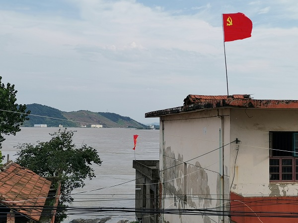 江西省九江市紀委監委黨員突擊隊在彭澤縣棉船鎮與群眾一起奮力抗汛,圖為黨旗在鎮渡輪碼頭高高飄揚。許久 攝