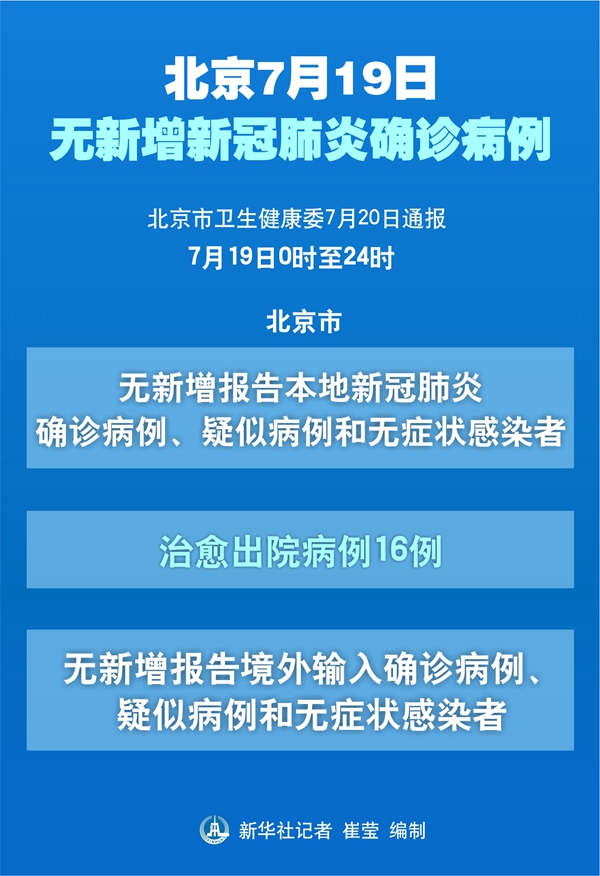 新華社北京7月20日電(記者俠克)北京市衛生健康委20日通報,7月19日0時至24時,北京市無新增報告本地新冠肺炎確診病例、疑似病例和無癥狀感染者,治愈出院病例16例;無新增報告境外輸入確診病例、疑似病例和無癥狀感染者。