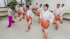 在銘傳高級中學的體育館外,志愿者扶一位老人上樓梯(7月19日手機拍攝)。 新華社記者 陳諾 攝