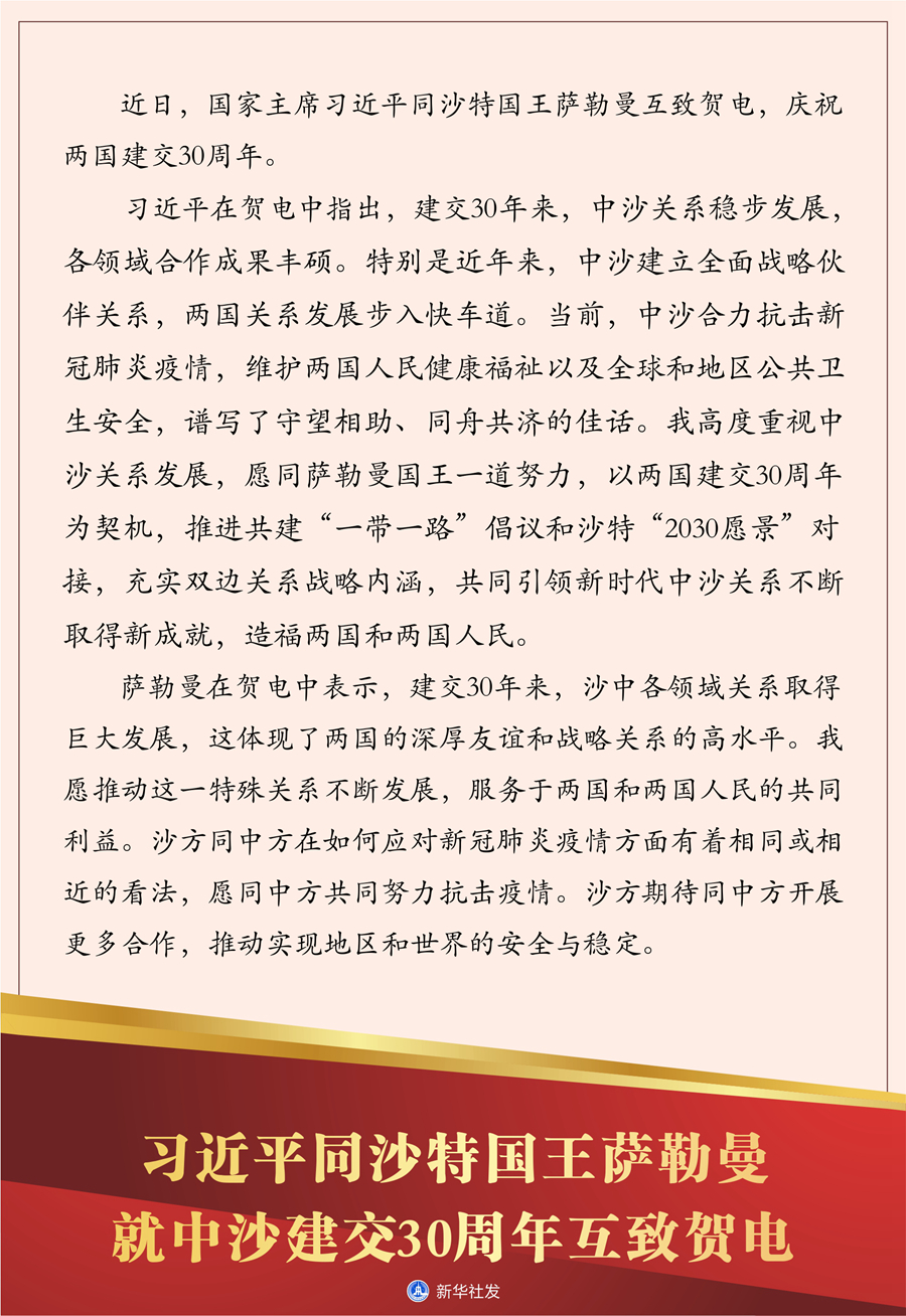 習(xí)近平在賀電中指出,建交30年來(lái),中沙關(guān)系穩(wěn)步發(fā)展,各領(lǐng)域合作成果豐碩。特別是近年來(lái),中沙建立全面戰(zhàn)略伙伴關(guān)系,兩國(guó)關(guān)系發(fā)展步入快車道。當(dāng)前,中沙合力抗擊新冠肺炎疫情,維護(hù)兩國(guó)人民健康福祉以及全球和地區(qū)公共衛(wèi)生安全,譜寫(xiě)了守望相助、同舟共濟(jì)的佳話。我高度重視中沙關(guān)系發(fā)展,愿同薩勒曼國(guó)王一道努力,以兩國(guó)建交30周年為契機(jī),推進(jìn)共建“一帶一路”倡議和沙特“2030愿景”對(duì)接,充實(shí)雙邊關(guān)系戰(zhàn)略內(nèi)涵,共同引領(lǐng)新時(shí)代中沙關(guān)系不斷取得新成就,造福兩國(guó)和兩國(guó)人民。