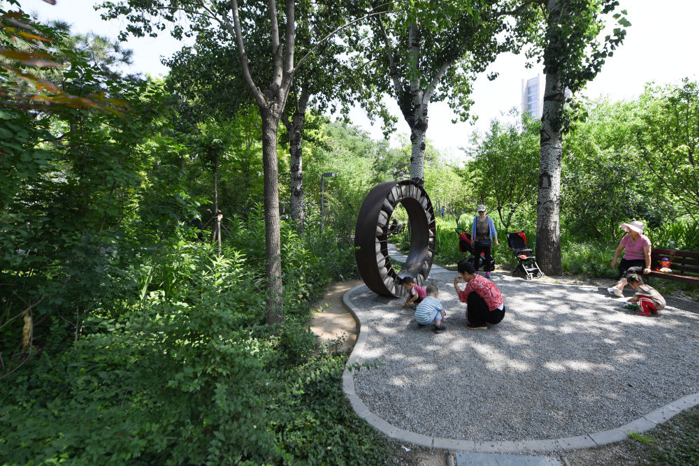 市民在北京市西城區(qū)“廣陽谷”城市森林內游玩(6月10日攝)。新華社記者 鞠煥宗 攝