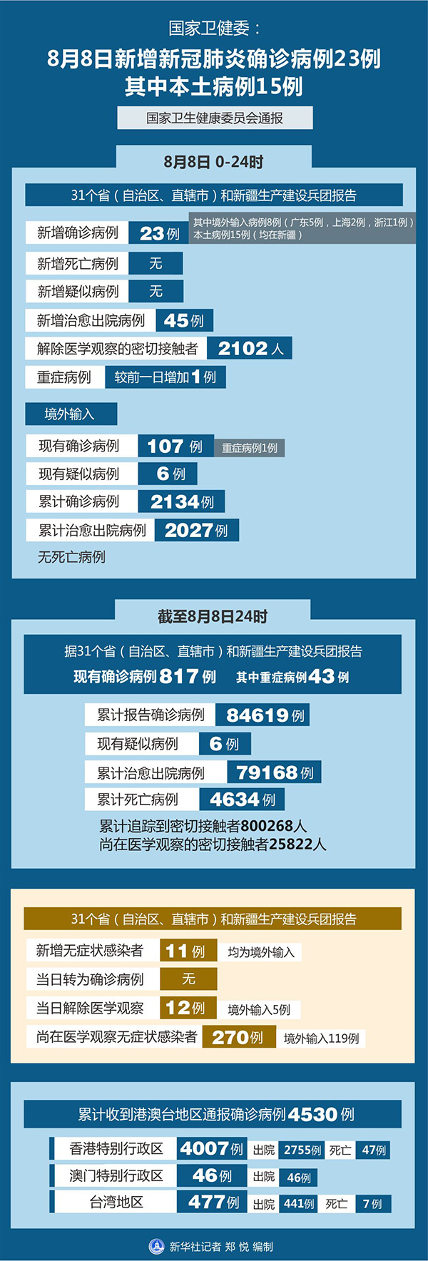 新華社北京8月9日電 國(guó)家衛(wèi)生健康委員會(huì)9日通報(bào),8月8日0—24時(shí),31個(gè)省(自治區(qū)、直轄市)和新疆生產(chǎn)建設(shè)兵團(tuán)報(bào)告新增新冠肺炎確診病例23例,其中境外輸入病例8例(廣東5例,上海2例,浙江1例),本土病例15例(均在新疆);無(wú)新增死亡病例;無(wú)新增疑似病例。