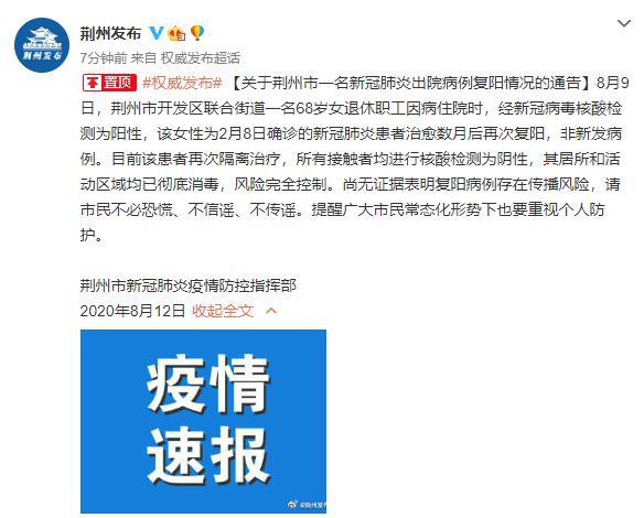 據(jù)湖北省荊州市新冠肺炎疫情防控指揮部12日通報(bào),8月9日,荊州市開(kāi)發(fā)區(qū)聯(lián)合街道一名68歲女退休職工因病住院時(shí),經(jīng)新冠病毒核酸檢測(cè)為陽(yáng)性,該女性為2月8日確診的新冠肺炎患者治愈數(shù)月后再次復(fù)陽(yáng),非新發(fā)病例。目前該患者再次隔離治療,所有接觸者均進(jìn)行核酸檢測(cè)為陰性,其居所和活動(dòng)區(qū)域均已徹底消毒,風(fēng)險(xiǎn)完全控制。尚無(wú)證據(jù)表明復(fù)陽(yáng)病例存在傳播風(fēng)險(xiǎn),請(qǐng)市民不必恐慌、不信謠、不傳謠。提醒廣大市民常態(tài)化形勢(shì)下也要重視個(gè)人防護(hù)。