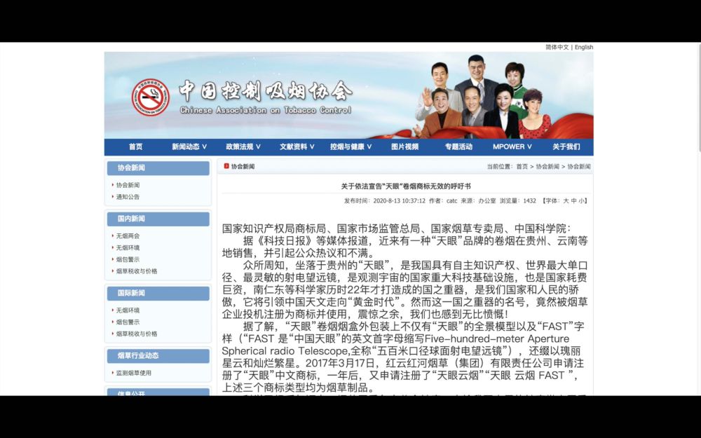 針對“天眼”被煙草企業(yè)注冊商標(biāo)并使用一事,中國控制吸煙協(xié)會(huì)8月13日在其官網(wǎng)發(fā)布聲明,希望國家知識產(chǎn)權(quán)局商標(biāo)局等部門對此事予以關(guān)注。