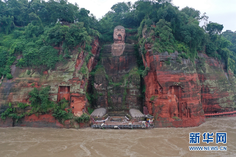 8月19日,隨著洪水減退,樂山大佛的腳趾已重新露出水面,水位退至佛腳平臺以下,一江之隔的鳳洲島水位也已退下。新華網(wǎng)發(fā)(李昕鋒 攝)