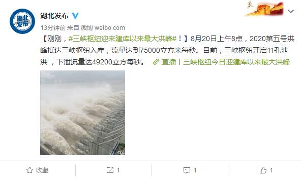 據湖北省人民政府新聞辦公室官方微博消息,三峽樞紐迎來建庫以來最大洪峰,當日上午8點,2020第五號洪峰抵達三峽樞紐入庫,流量達到75000立方米每秒。