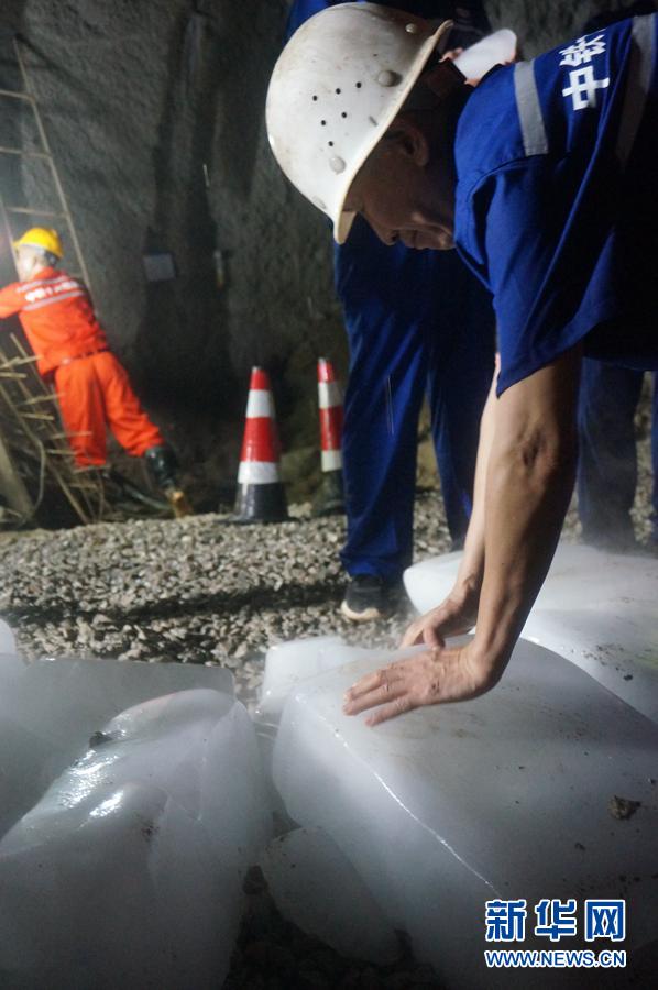 隧道內的溫度高達40攝氏度,結束作業的工人在用冰塊降溫。新華網記者劉瓊 攝