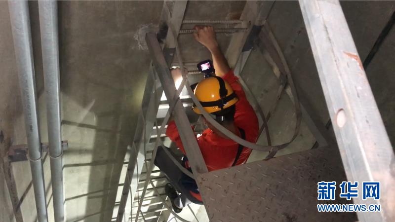 8月12日凌晨兩點,贛州工務段贛州高鐵路橋工區工長寧建平攀登檢查梯,檢查橋塔斜拉索上部鋼錨箱內設備狀態。南昌鐵路局供圖