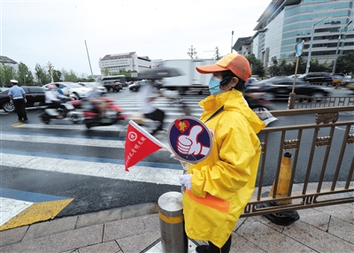 8月13日,西單路口,文明引導(dǎo)員在雨中維護路口秩序。新京報記者 王貴彬 攝