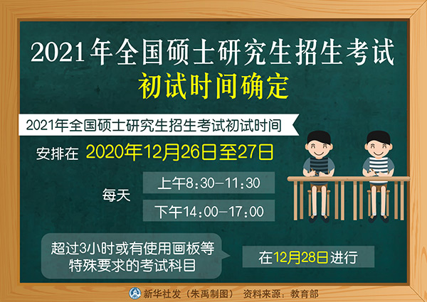 新華社北京9月4日電(記者胡浩)記者4日從教育部了解到,2021年全國碩士研究生招生考試初試時間安排在2020年12月26日至27日(每天上午8:30-11:30,下午14:00-17:00),超過3小時或有使用畫板等特殊要求的考試科目在12月28日進(jìn)行。
