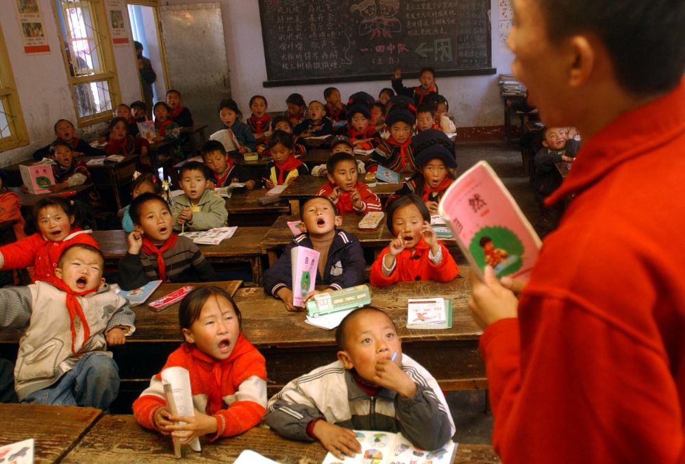 ↑ 2006年1月13日,“掃盲夜校”學員在甘肅漳縣三岔鎮中心小學上課。