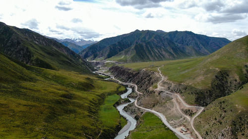 青海省果洛藏族自治州瑪沁縣雪山鄉(xiāng)陰柯河村周邊草場,遠處可看到阿尼瑪卿雪山一角(8月20日攝,無人機照片)。新華社記者 張龍 攝