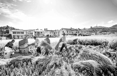 湖北省竹溪縣中峰鎮狄裕溝村農民在金色貢米田園收割先成熟的稻谷。溫大樹攝/光明圖片