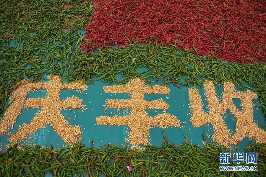 2020年慶祝中國農民豐收節暨循化縣消費扶貧“辣椒節”上由線辣椒和玉米拼成的慶豐收圖案。(新華網潘彬彬攝)