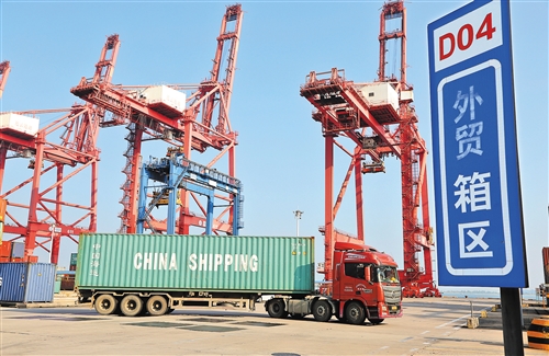 近日,運輸車輛在江蘇連云港集裝箱碼頭轉(zhuǎn)運集裝箱準備裝船出口國外。 海關(guān)總署發(fā)布的數(shù)據(jù)顯示,今年前8個月,我國貨物貿(mào)易進出口總值20.05萬億元,同比下降0.6%,降幅持續(xù)收窄,接近“轉(zhuǎn)正”。