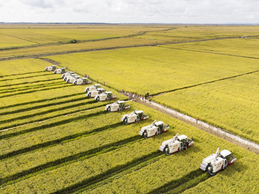 9月22日在黑龍江省富錦市萬畝水稻公園內(nèi)拍攝的開鐮儀式現(xiàn)場(無人機(jī)照片)。新華社發(fā)(張濤攝)