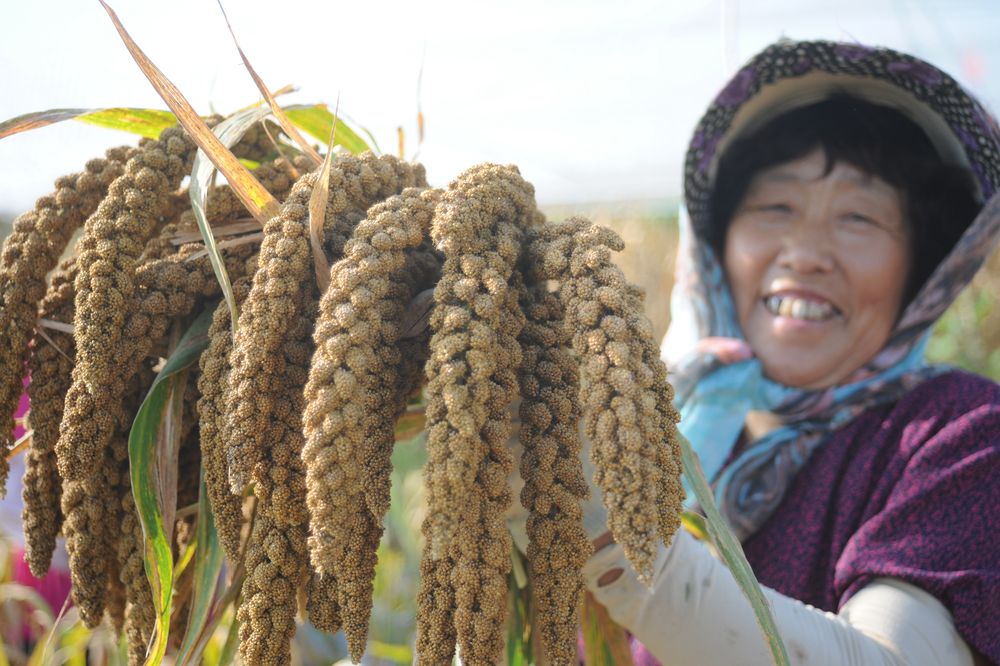 9月22日,山東省煙臺市福山區(qū)老官莊村農(nóng)民展示剛剛收獲的無公害谷子。新華社發(fā)(申吉忠 攝)