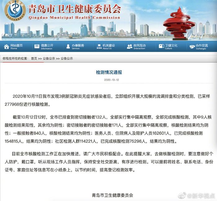 青島市衛(wèi)生健康委員會(huì)發(fā)布檢測(cè)情況通報(bào)稱(chēng),2020年10月11日我市發(fā)現(xiàn)3例新冠肺炎無(wú)癥狀感染者后,立即組織開(kāi)展大規(guī)模的流調(diào)排查和分類(lèi)檢測(cè),已采樣277968份進(jìn)行核酸檢測(cè)。