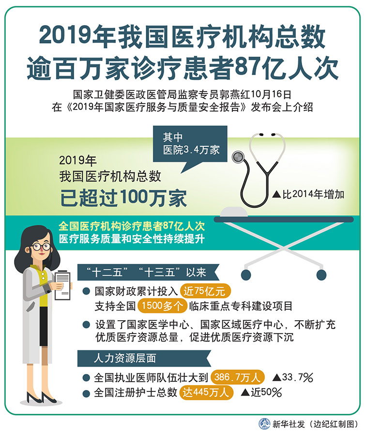 新華社北京10月16日電(記者呂諾、王琳琳)國(guó)家衛(wèi)健委醫(yī)政醫(yī)管局監(jiān)察專(zhuān)員郭燕紅16日在《2019年國(guó)家醫(yī)療服務(wù)與質(zhì)量安全報(bào)告》發(fā)布會(huì)上介紹,2019年,我國(guó)醫(yī)療機(jī)構(gòu)總數(shù)已超過(guò)100萬(wàn)家,其中醫(yī)院3.4萬(wàn)家。全國(guó)醫(yī)療機(jī)構(gòu)診療患者87億人次,醫(yī)療服務(wù)質(zhì)量和安全性持續(xù)提升。