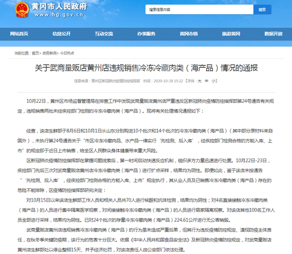 10月22日,黃州區(qū)市場監(jiān)督管理局在排查工作中發(fā)現(xiàn)武商量販店黃州店嚴(yán)重違反區(qū)新冠肺炎疫情防控指揮部第24號通告有關(guān)規(guī)定,違規(guī)銷售兩批未經(jīng)疾控部門檢測的冷凍冷藏肉類(海產(chǎn)品)。現(xiàn)將有關(guān)處理情況通報如下: