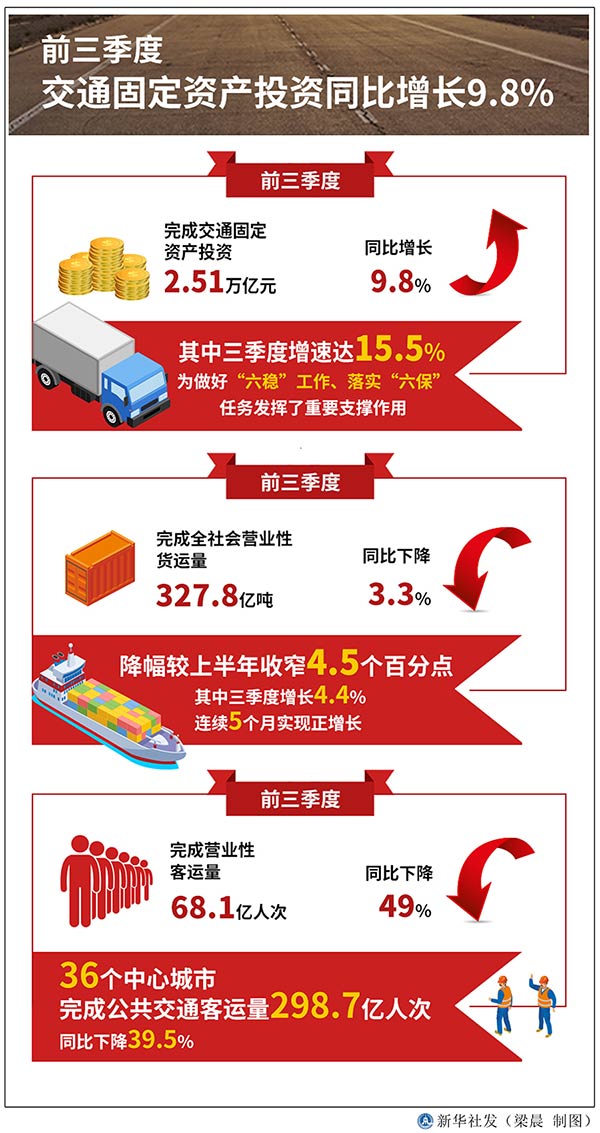 新華社北京10月28日電(記者魏玉坤)交通運輸部新聞發言人、政策研究室主任吳春耕28日在國新辦發布會上表示,前三季度,完成交通固定資產投資2.51萬億元,同比增長9.8%,其中三季度增速達15.5%,為做好“六穩”工作、落實“六?!比蝿瞻l揮了重要支撐作用。