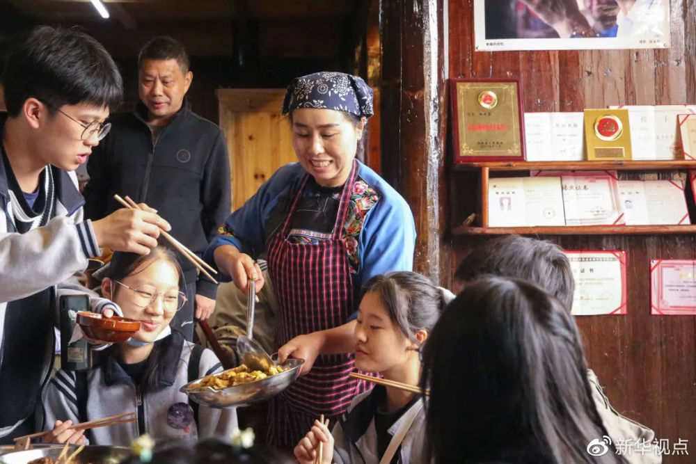 10月26日,十八洞村村民施進蘭的妻子龍齊英(中)在農家樂給游客們上菜(受訪者供圖) 新華社發
