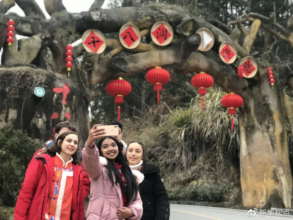 1月18日,多位外國友人受邀來到湘西十八洞村參加十八洞村的小年“村晚”,他們在十八洞村口合影 新華社記者張玉潔 攝