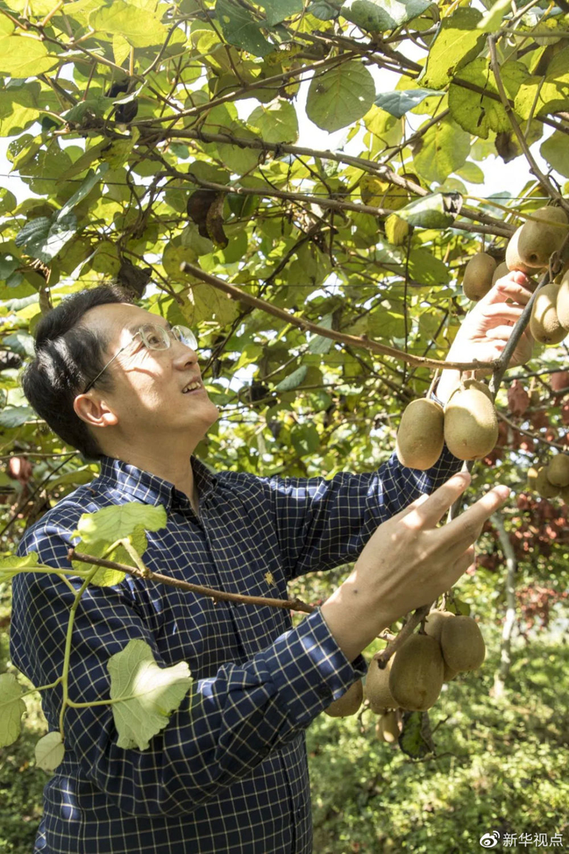 2018年,十八洞村第二任扶貧工作隊長石登高在十八洞村的獼猴桃產業基地查看獼猴桃長勢 新華社發