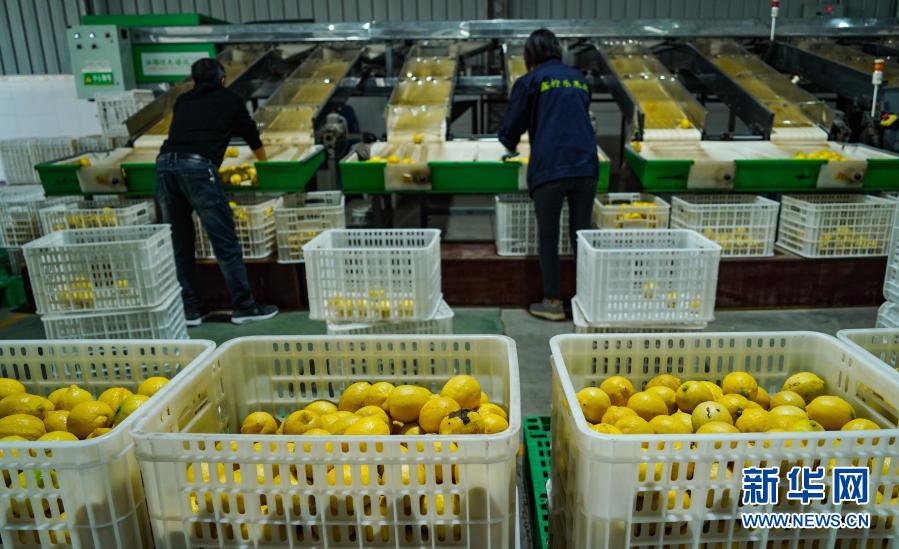 在四川省資陽(yáng)市安岳縣鑫檸樂(lè)果業(yè)有限公司車間,工人通過(guò)生產(chǎn)線分裝檸檬(11月11日攝)。新華社記者 王曦 攝