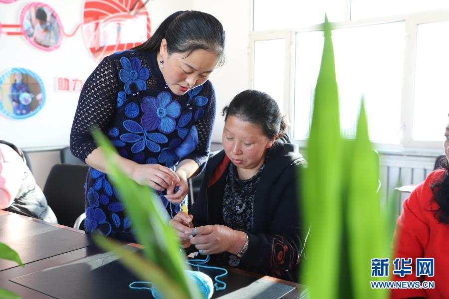 10月29日,在黑龍江省鶴崗市綏濱縣忠仁鎮黎明村的編織工作室,李明鴿(左)輔導村民做手工編織。新華社記者 徐凱鑫 攝