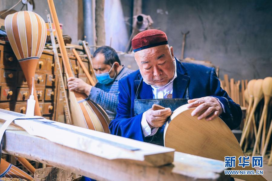 在村里,艾依提·依明與其他幾位“非遺”傳承人,不僅是技藝傳播者,也是致富帶頭人。因?yàn)榘捞帷ひ烂髦谱鞯臉菲饕艄?jié)準(zhǔn)、音色美、造型漂亮,深受市場(chǎng)歡迎,附近很多村民慕名前來(lái)拜師學(xué)藝。他回憶,幾十年來(lái),他已帶出200多名徒弟,這些來(lái)自貧困家庭的農(nóng)村年輕人通過幾年學(xué)習(xí),基本都可以靠樂器制作、維修、演奏實(shí)現(xiàn)增收。