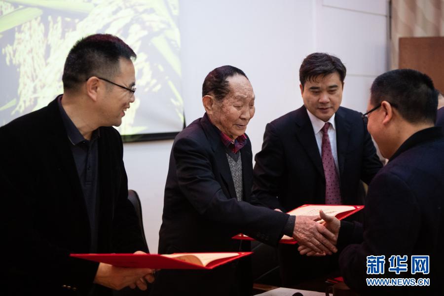11月13日,在湖南雜交水稻研究中心舉行的“袁隆平農業科技獎”頒獎儀式上,袁隆平(左二)給獲獎人員頒獎。新華社記者 陳思汗 攝