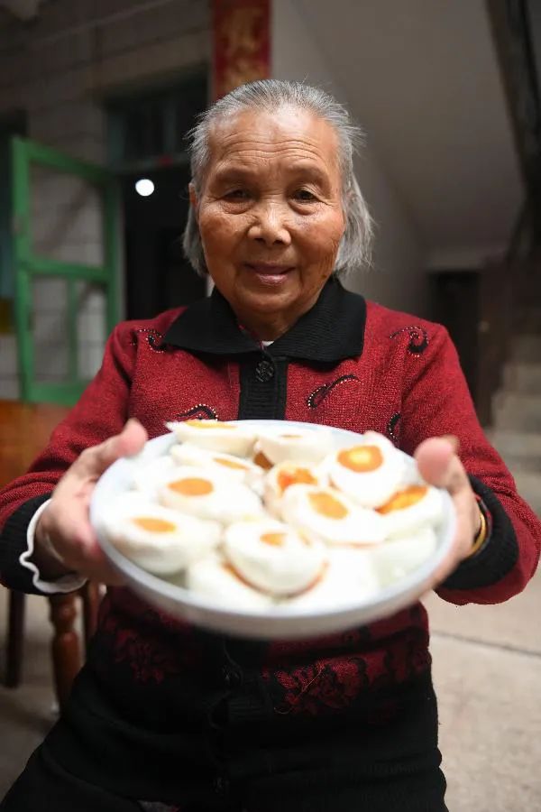 全國脫貧攻堅獎奮進(jìn)獎獲得者廖秀英老奶奶在贛州瑞金市葉坪鄉(xiāng)鳳崗村家中向游客展示咸鴨蛋 劉青 攝