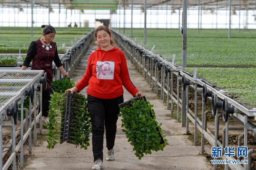 在新疆阿克陶縣現代設施農業產業扶貧基地,工人在育苗溫室內搬運菜苗(3月22日攝)。新華社記者 丁磊 攝