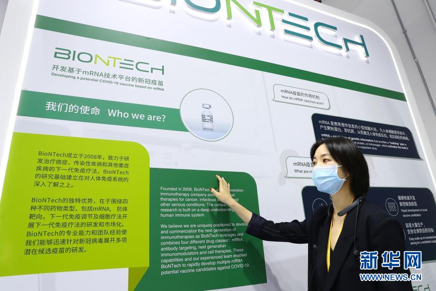 11月5日,在第三屆中國國際進口博覽會上,工作人員在醫療器械及醫藥健康展區介紹由復星醫藥與德國拜恩泰科合作開發的新冠病毒mRNA(信使核糖核酸)疫苗。新華社記者 張玉薇 攝