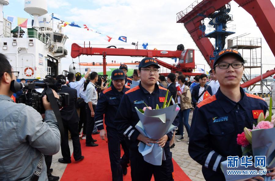 11月28日,在三亞市南山港,“探索一號”科考船的科考人員下船接受歡迎人群的迎接。新華社記者 趙穎全 攝
