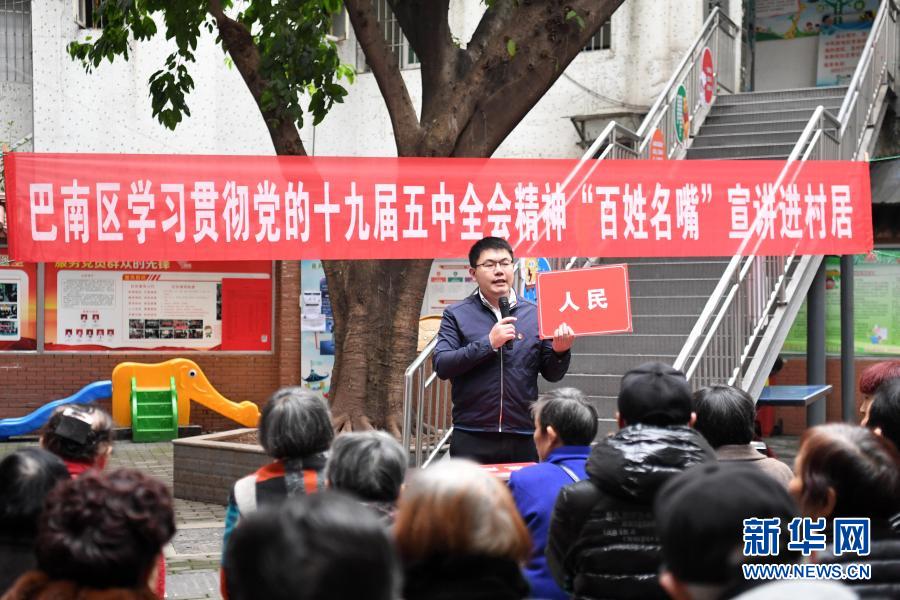 12月1日,宣講員向群眾宣講黨的十九屆五中全會精神。12月1日,重慶市巴南區魚洞街道魚新街社區舉行學習貫徹黨的十九屆五中全會精神“百姓名嘴”進村居活動。據介紹,重慶市巴南區“百姓名嘴”宣講團是由基層干部、教師、民間藝人等基層理論骨干自愿組成的理論宣講隊伍,現有宣講員85名。宣講團成員將理論宣講與評書、快板、三句半、木洞山歌等文藝形式相結合,目前已在巴南區開展了110余場學習貫徹黨的十九屆五中全會精神宣講活動。新華社記者 唐奕 攝