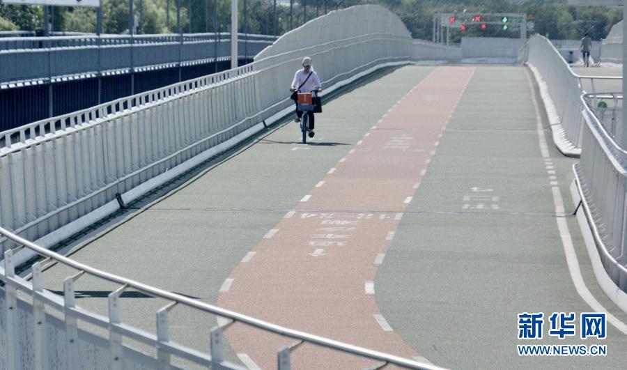 市民在“回天地區”一處自行車專用騎行道騎行(8月10日攝)。新華社記者 李欣 攝