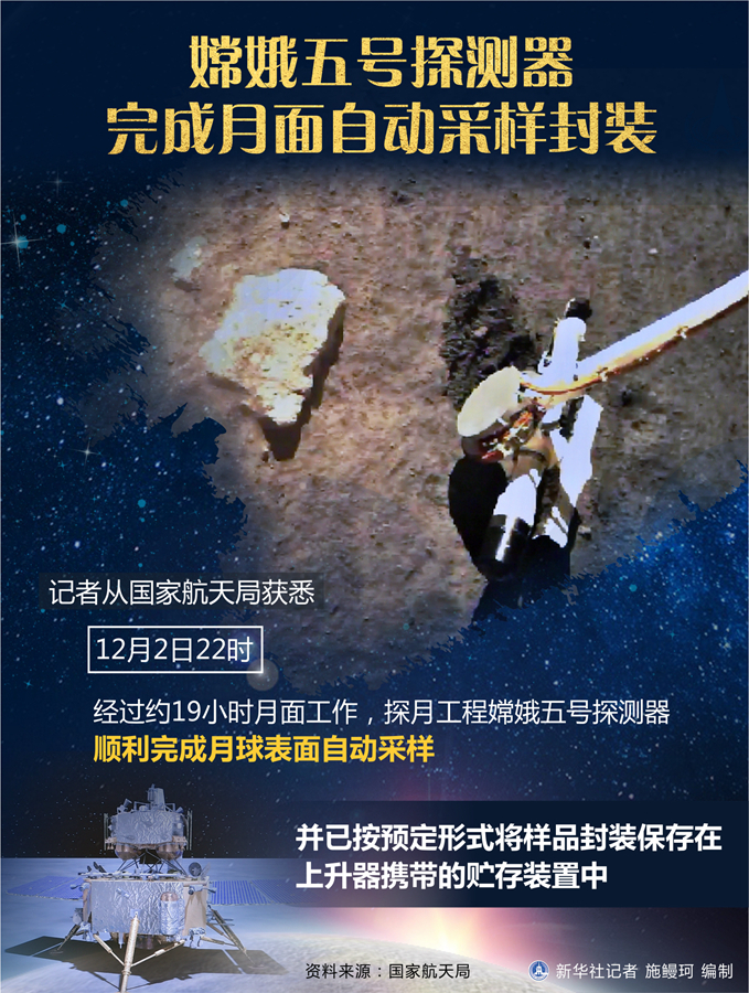 嫦娥五號探測器完成月面自動采樣封裝 有效載荷工作正常-新華網