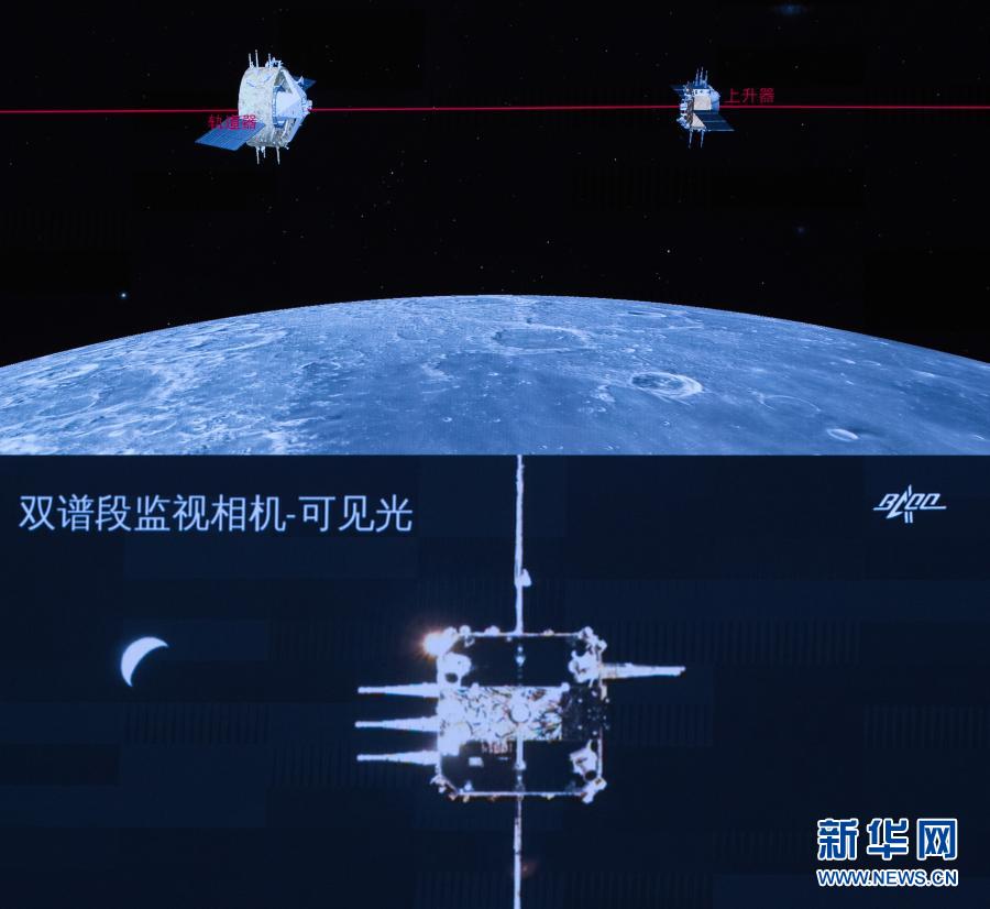 記者從國家航天局獲悉,12月6日5時(shí)42分,嫦娥五號(hào)上升器成功與軌道器返回器組合體交會(huì)對(duì)接,并于6時(shí)12分將月球樣品容器安全轉(zhuǎn)移至返回器中。這是我國航天器首次實(shí)現(xiàn)月球軌道交會(huì)對(duì)接。新華社記者 金立旺 攝
