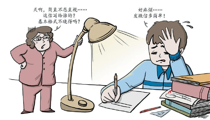 齊齊從小學一年級就開始練習毛筆字,如今已經能寫出很不錯的行書,但他也從不寫信,“有必要嗎?”齊齊說,父母要求他每個月要給遠在老家的祖父母、外祖父母打電話,每次電話的通話時間也就兩三分鐘,“我爸他們也就是問奶奶吃飯了沒,多買點吃的,不舒服趕緊去醫院……就這幾句話,真沒營養?!?/p>
