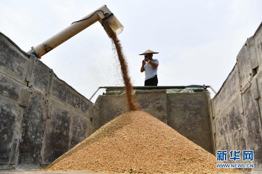 在貴州省思南縣塘頭鎮芭蕉壩區,農民用卡車在裝載新收獲的小麥(5月13日攝)。