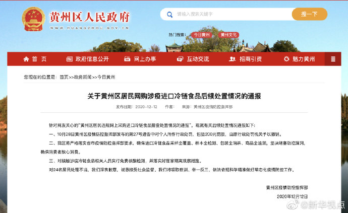 湖北省黃岡市黃州區人民政府網站12日發布通報,撤銷對網購涉疫進口冷鏈食品個人所作的行政處罰,包括200元罰款。 ????