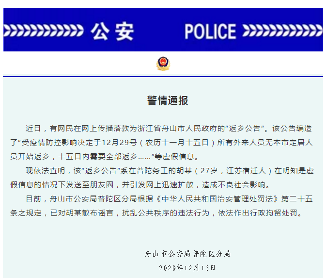 男子散布“舟山要求外來人員返鄉”謠言,已被行拘